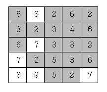 이제 위와 같은 지역에 많은 비가 내려서 높이가 4 이하인 모든 지점이 물에 잠겼다고 하자. 이 경우에 물에 잠기는 지점을 회색으로 표시하면 다음과 같다.