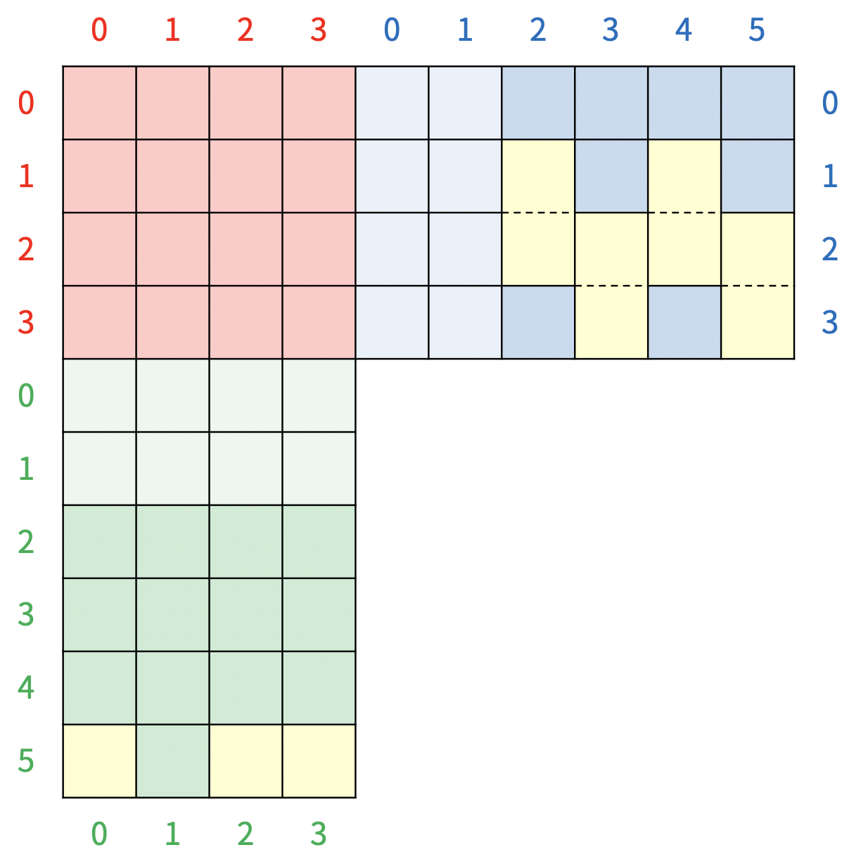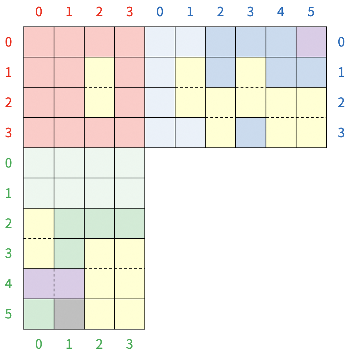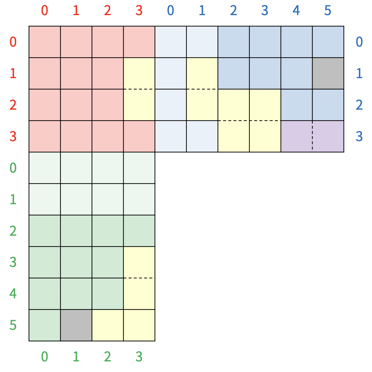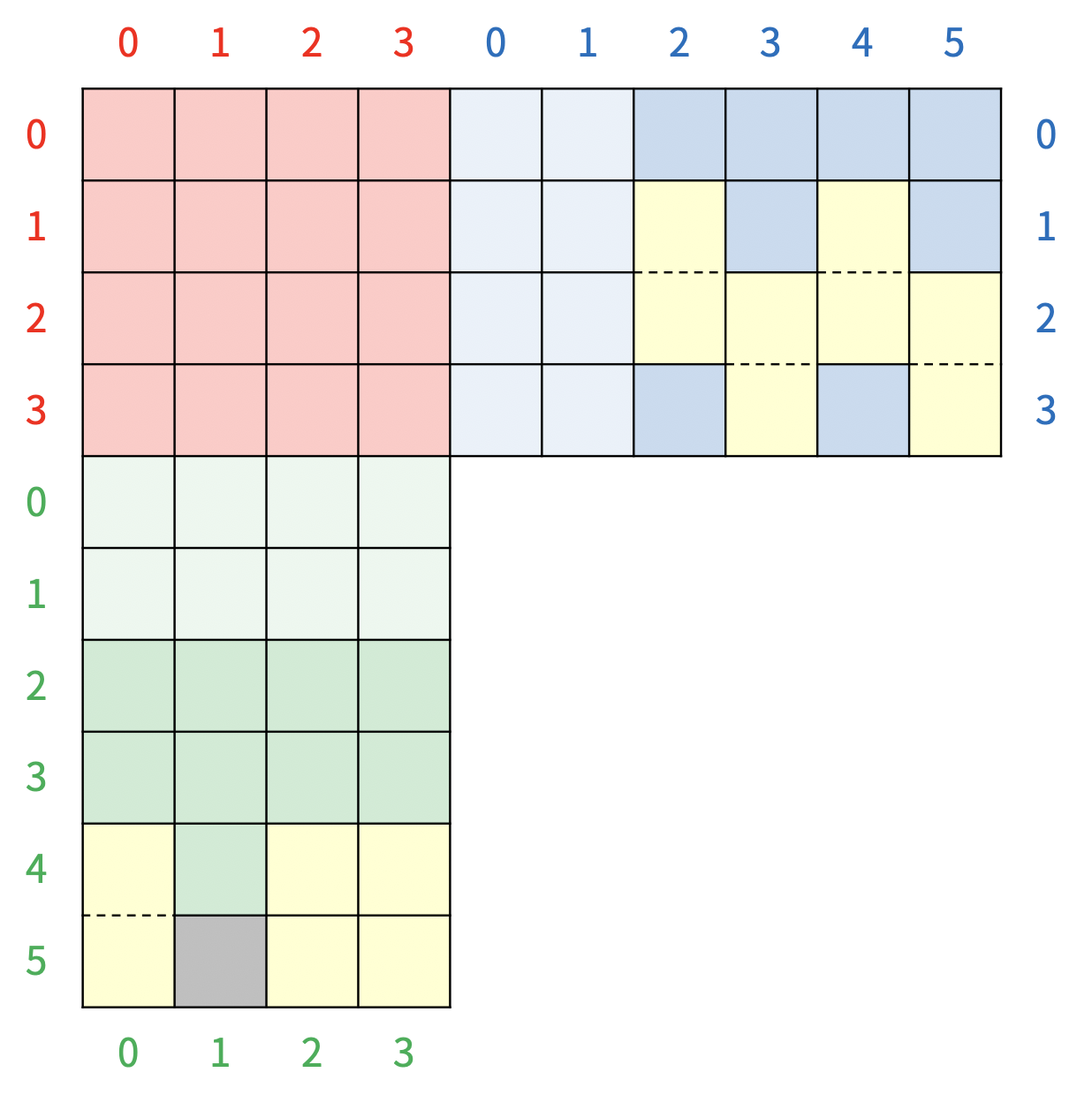 초록색 보드의 0, 1번 행과 파란색 보드의 0, 1번 열은 그림에는 연한색으로 표현되어 있는 특별한 칸이다. 초록색 보드의 0, 1번 행에 블록이 있으면, 블록이 있는 행의 수만큼 아래 행에 있는 타일이 사라지고, 초록색 보드의 모든 블록이 아래로 경계를 만나기 전까지 이동하고, 파란색 보드의 0, 1번 열에 블록이 있으면, 블록이 있는 열의 수만큼 오른쪽 열에 있는 타일이 사라지고, 파란색 보드의 모든 블록이 오른쪽으로 경계를 만나기 전까지 이동하게 된다. 위의 그림은 파란색 보드의 1번 열에 블록이 있기 때문에, 5번 열에 있는 블록이 모두 사라지고, 파란색 보드의 모든 블록이 오른쪽으로 한 칸 이동하게 된다. 따라서, 보드는 <그림 8>과 같이 변하게 된다.