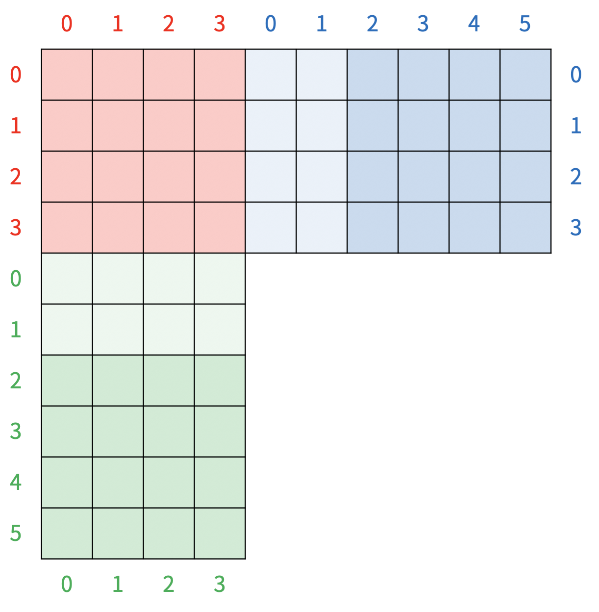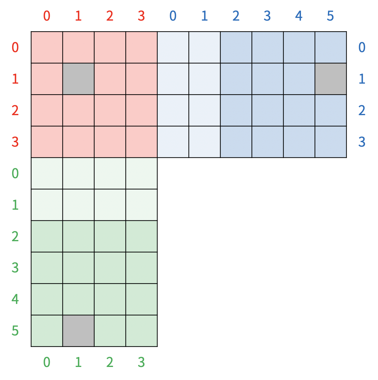 모노미노도미노는 아래와 같이 생긴 보드에서 진행되는 게임이다. 보드는 빨간색 보드, 파란색 보드, 초록색 보드가 그림과 같이 붙어있는 형태이다. 게임에서 사용하는 좌표 (x, y)에서 x는 행, y는 열을 의미한다. 빨간색, 파란색, 초록색 보드가 사용하는 좌표는 그 색으로 그림에 적혀있다.